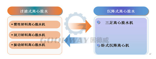 離心脫水機根據脫水物料顆粒度粗細,可以分為兩大類:過濾式離心脫水機和沉降式離心脫水機。過濾式脫水有根據卸料方式的不同分為:慣性卸料、刮刀卸料和振動卸料三種。沉降式離心脫水機根據產品結構可以分為三足離心脫水機和臥式沉降離心機兩種。其中過濾式離心脫水機主要用于較粗物料的脫水,沉降式離心脫水主要用于細顆粒物料的脫水。